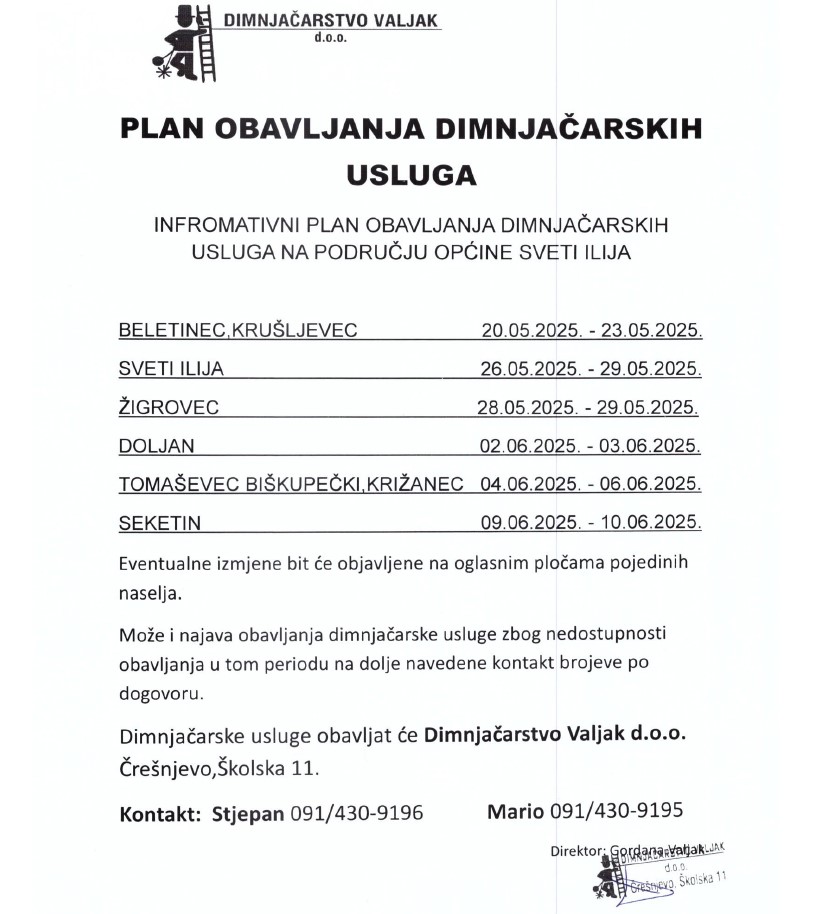 U nastavku donosimo obavijest o obavljanju dimnjačarskih usluga na području Općine Sveti Ilija po naseljima: